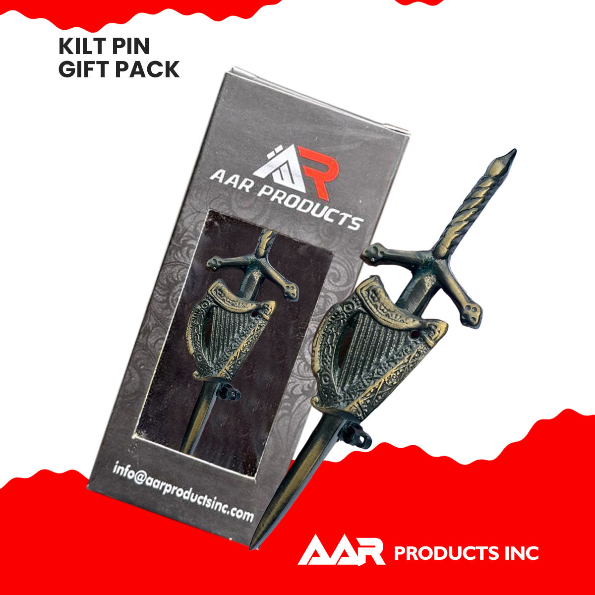 Kilt Pin is an essential part of highland wear. Irish Celtic Harp Sword kilt Pin functionality will add beauty and security to your kilt. AAR Kilt Pin comes with Swivel Fastening Pin on the Back for easily locking and unlocking. It is a 4 inches long which is a standard kilt pin size. AAR Irish Celtic Harp Sword kilt Pin Made with High Quality Material and cannot be compare with ordinary kilt pins on sale by other sellers. We are very confident that you would be happy with our products and will be our returning customer in future purchases.