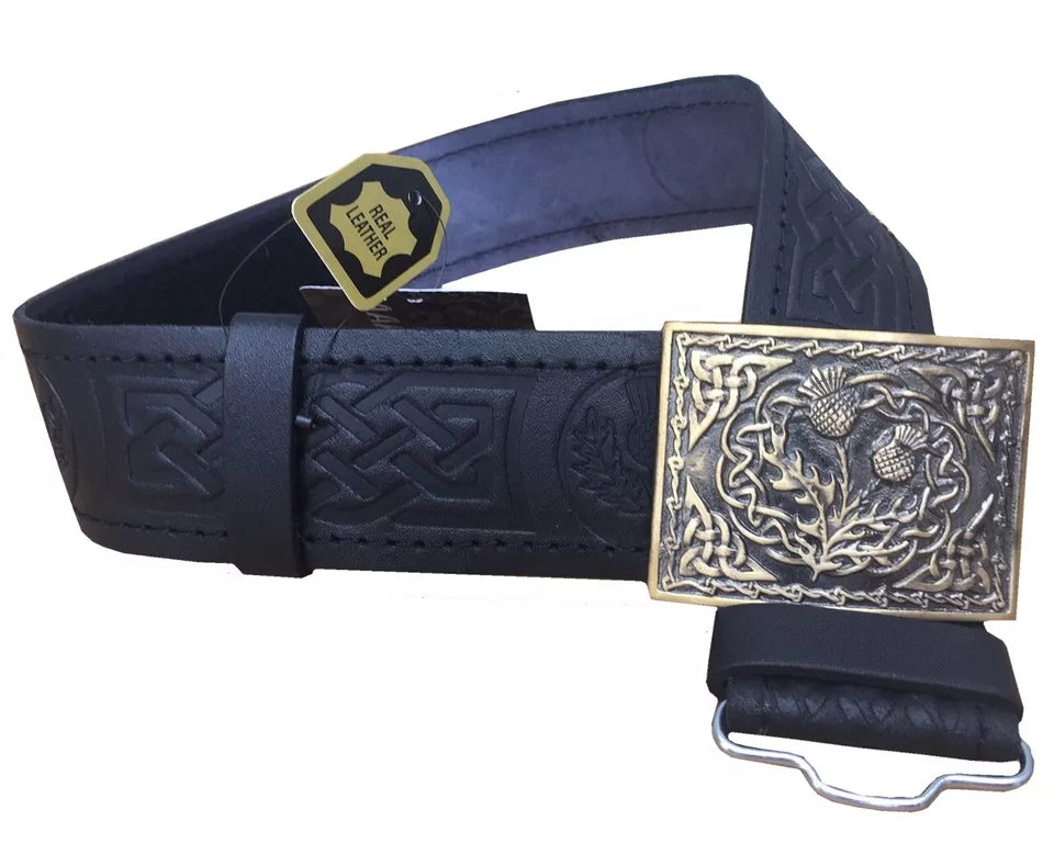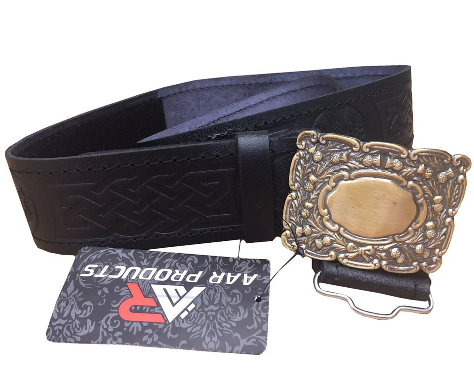 Complete your Highland outfit with the AAR Leather Thistle Design Kilt Belt, made from premium black leather and paired with a bold brass antique-finish Celtic buckle. Designed for durability and comfort, this belt adds both function and heritage style to any kilt ensemble.