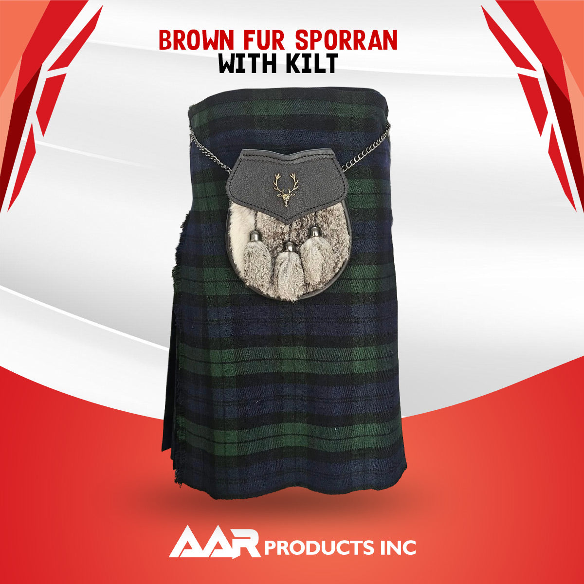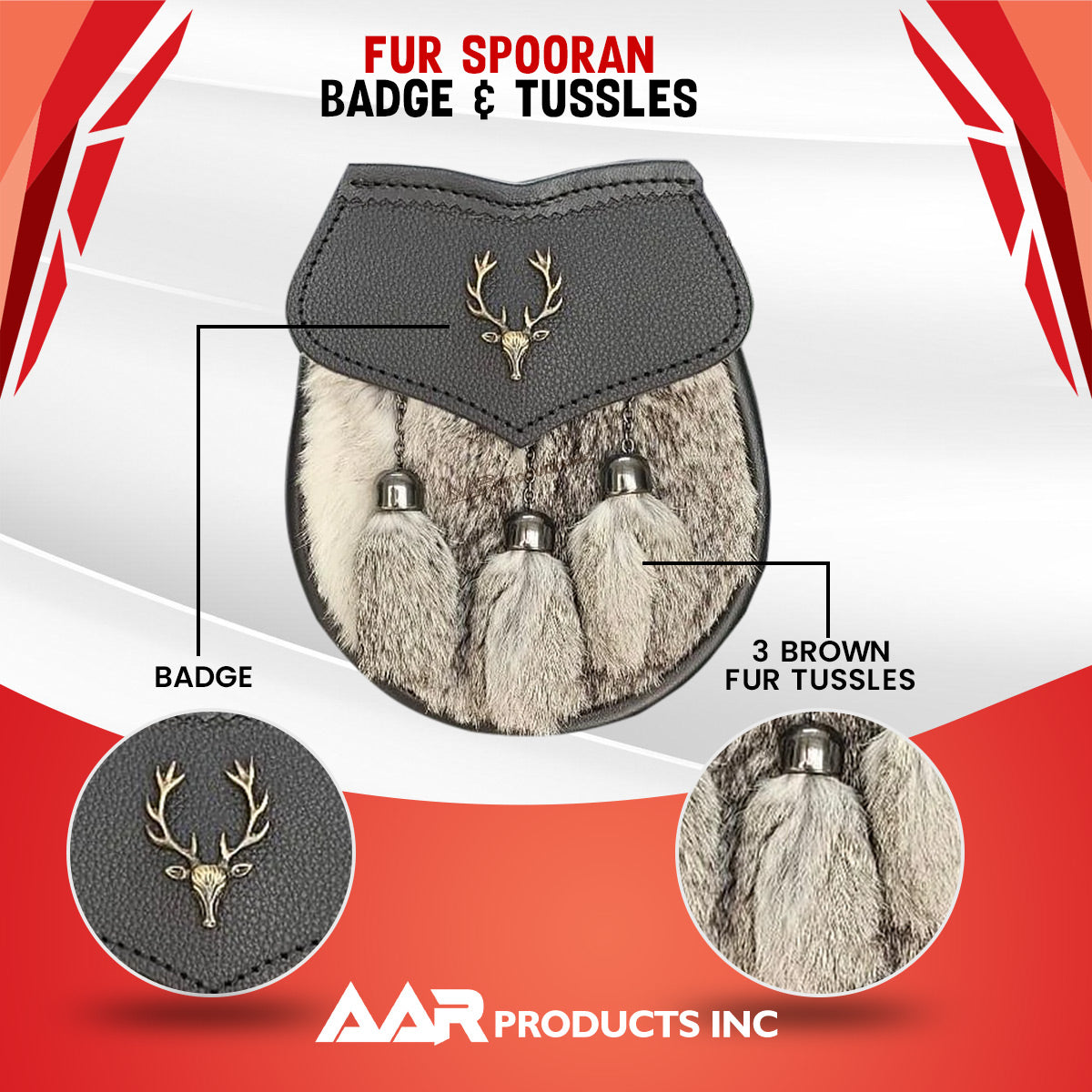Product Name: AAR Scottish Semi Dress Formal Brown Fur Leather Sporrans with Antique Multi Design Badges