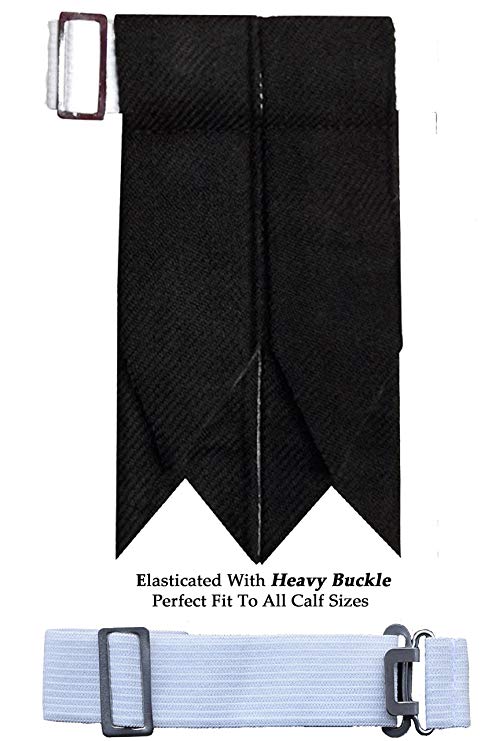 Solid Plain Black Flash Kilt Hose/Sock. The flash are mounted on 1" (3cm) wide white elastic with velcro adjusters and fit all sizes The back of the flash has a strip of fusing on it to give it stiffness to stop it flapping Flashes are an essential part of your kilt outfit. Flash are sold in pairs. Money Back Guarantee.